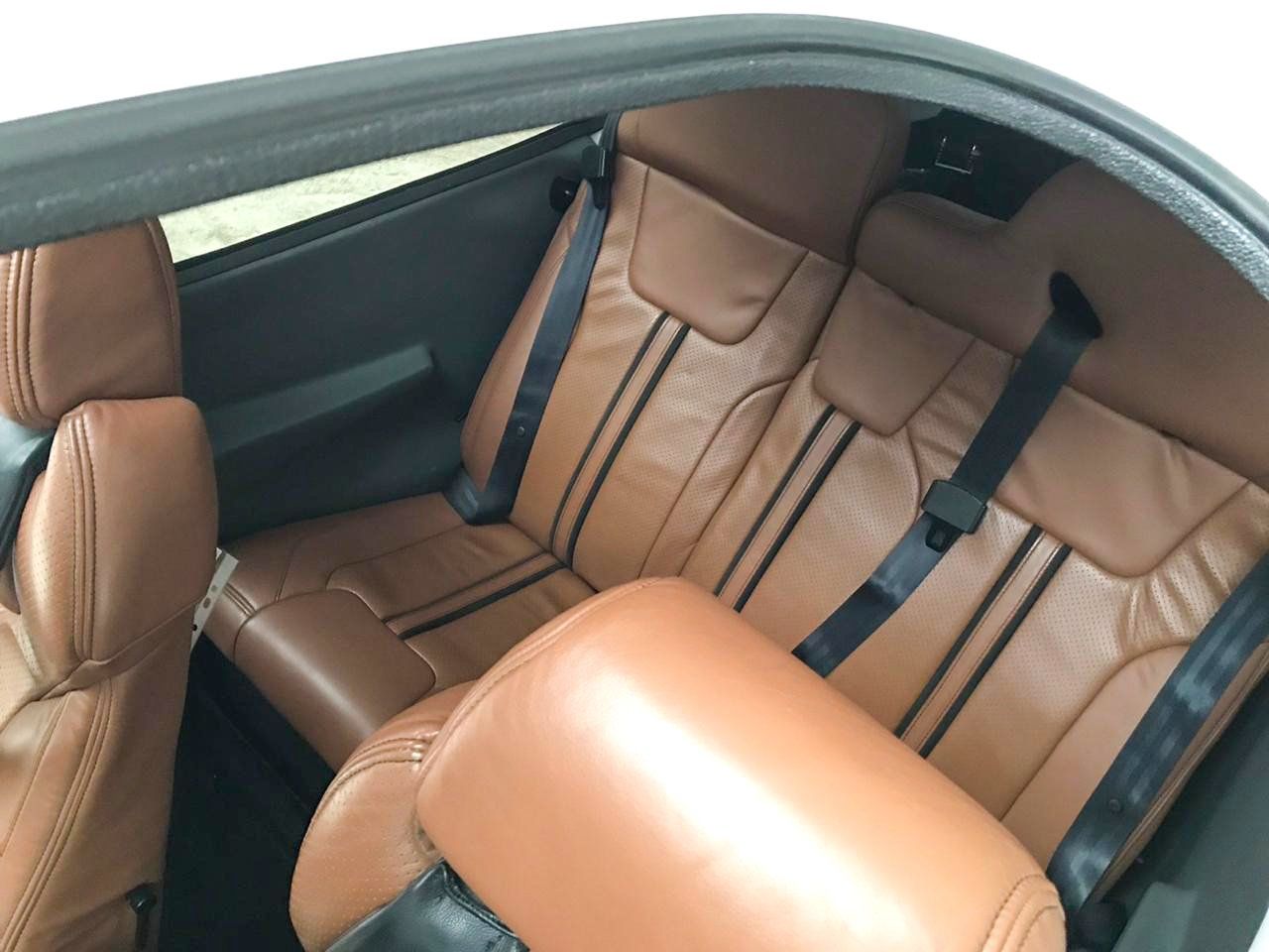 - Dark brown leather seats with black carped